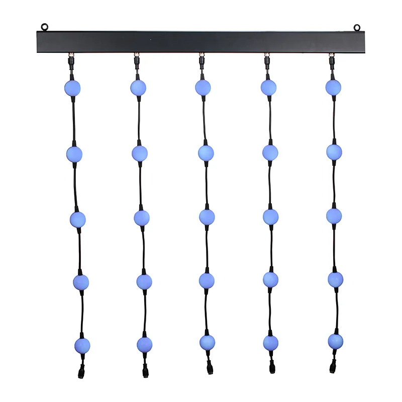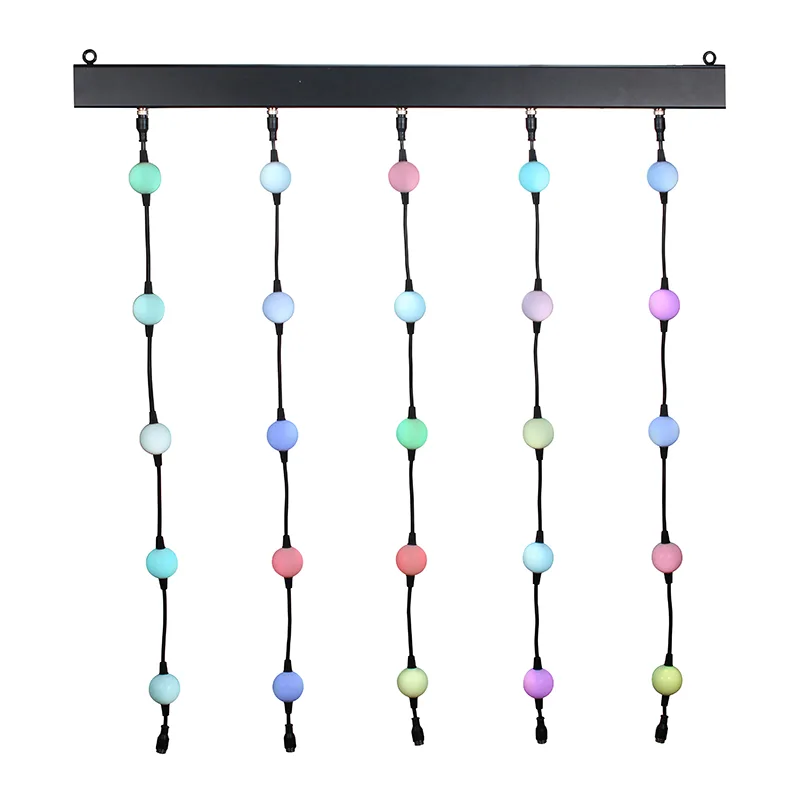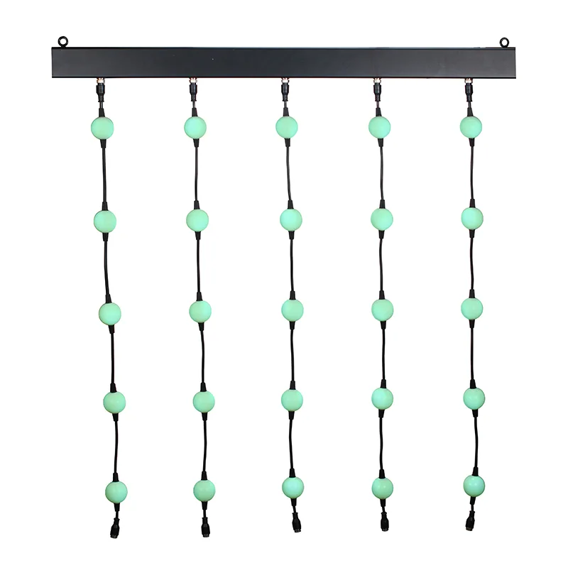 تشتمل كل مجموعة كاملة على وحدة تحكم واحدة (5 مخارج) و30 × 1 متر خيوط كروية LED (5 كرات لكل سلسلة). يدعم كل مخرج وحدة تحكم طولًا يصل إلى 6 أمتار (مسافة 200 مم، إجمالي 30 كرة)، مع تحكم فردي من بكسل إلى بكسل للحصول على تأثيرات إضاءة مخصصة ودقيقة.